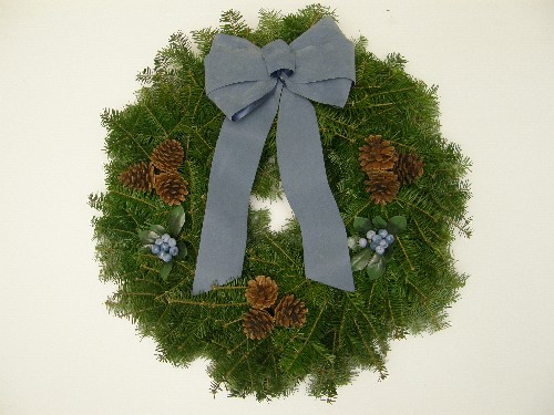 Atlantic Blue WreathA 24" fresh fragrant, balsam wreath decorated with lifelike blue berries, 3 grouping of natural pinecones and a 7 loop beautiful handmade velvet blue weatherproof bow. Weight about 4lbs.25.00 CAD + Shipping |