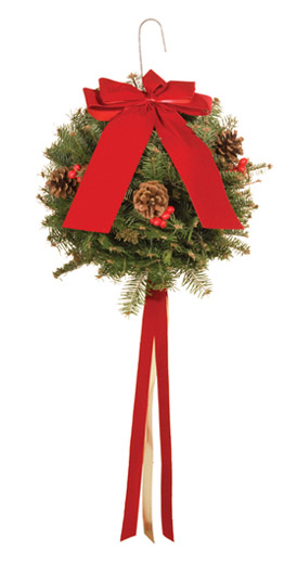 Kissing ballDelight holiday visitors with this festive kissing ball made with fresh balsam fir. Decorated with real pine cones, faux holly berries, red/gold streamers and a red velvet bow.25.00 CAD + Shipping |
